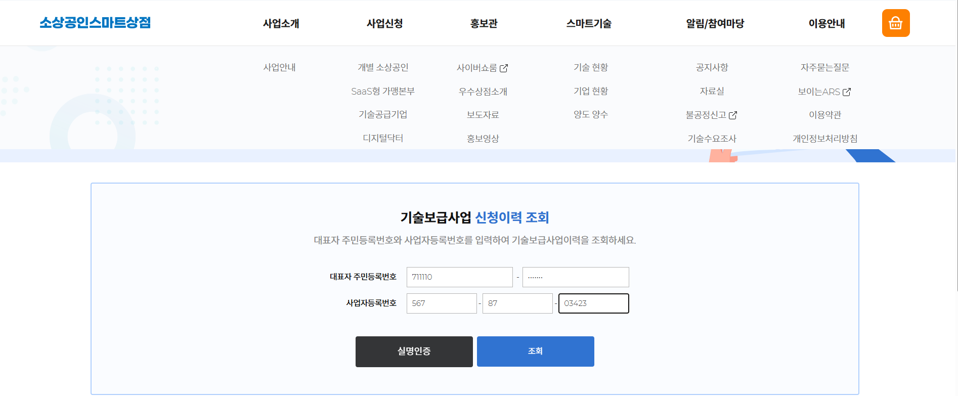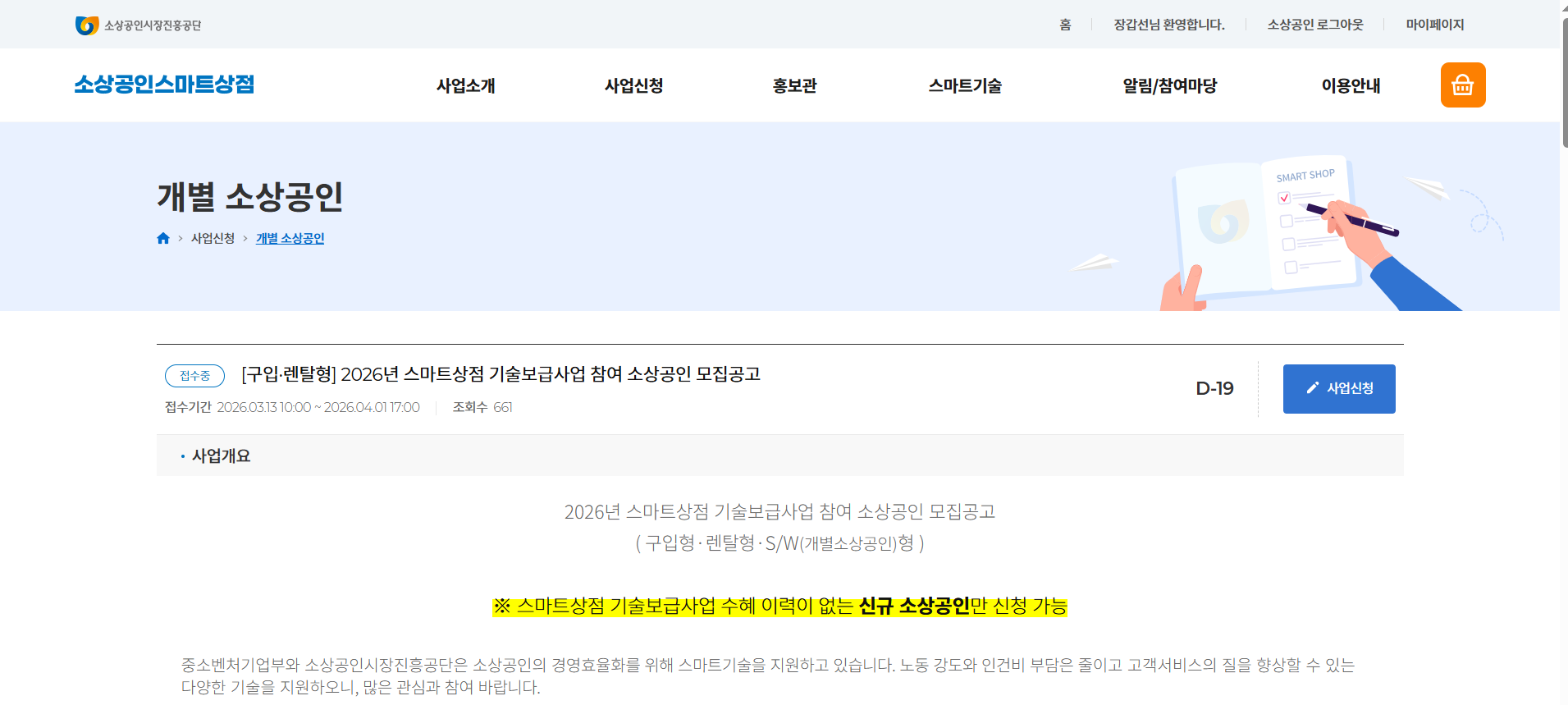 - 소상공인시장진흥공단 홈페이지에 접속해서 '스마트상점 기술보급 사업' 공고를 확인하세요.